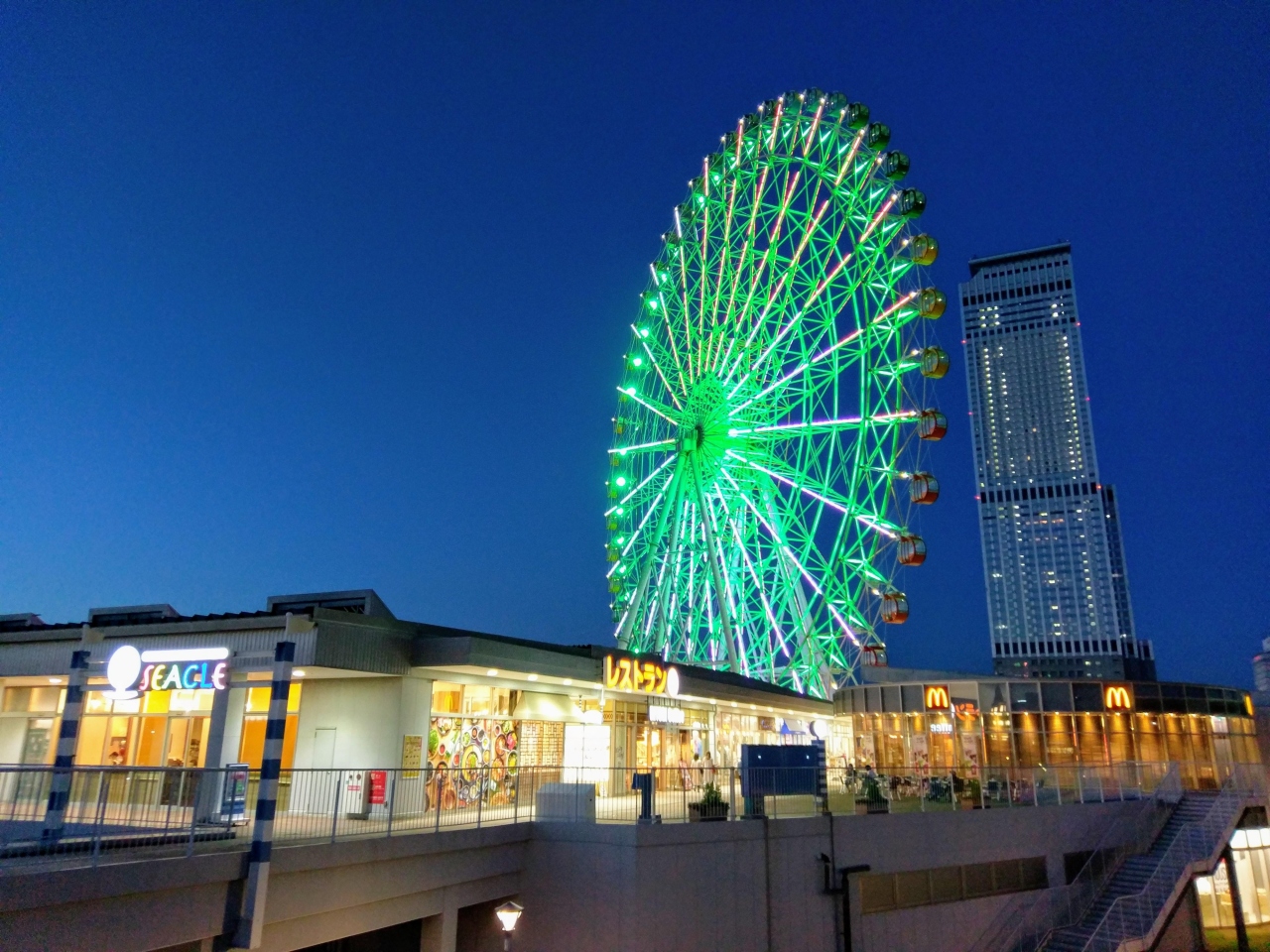 日が暮れてから行くと大観覧車「りんくうの星」がとても美しく見れました。乗るとたいしたことない700円の大観覧車ですが、夜に眺めると見ごたえがあります。昼間は暑い9月ですが、夜は海沿いの立地で快適でした。
