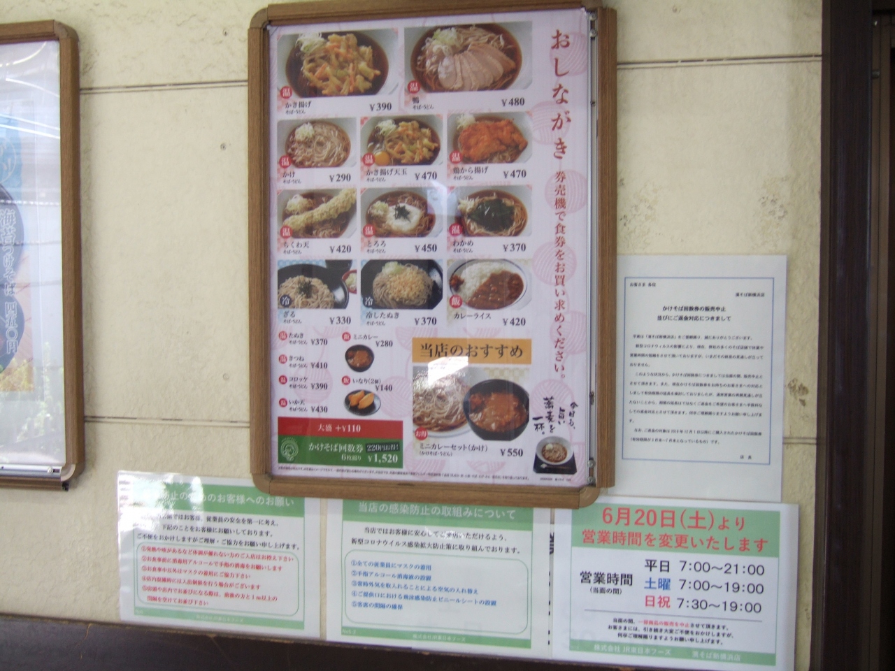 新横浜駅の横浜線ホーム、東神奈川寄りにある立ち食い蕎麦。夏なので冷たいそばを食べようと思いましたが、冷たいメニューはざると冷やしタヌキのみ。温かいそばは唐揚げや鴨を乗せたものもあり、カレーライスも意外と旨いのですが・・・夏には残念。