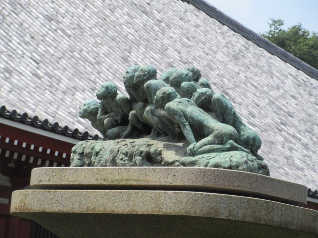 浅草の浅草寺の敷地にあります。朝倉文夫さんという有名な彫刻家の作品です。朝倉さんについては、前に日暮里の近くにある「朝倉彫塑館」にも行きましたが、とても素敵な彫刻がたくさん見られました。その方の作品が展示されているのですが、結構目立つゾーンにあるものの植え込みの奥のためか、あまり気にされていないのはちょっと残念。昔ここには噴水があったそうで、その場所に建っている銅像です。