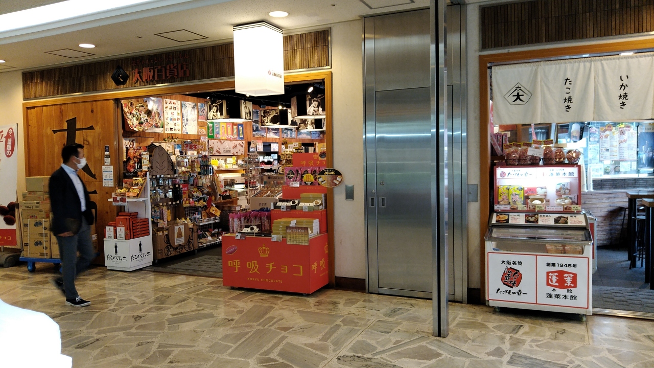 いか焼きや豚まん(蓬莱)、阪神タイガースやビリケンさまグッズなど昔からの大阪名物が所狭しと並んでいる一方、「呼吸チョコ」など最近話題の大阪発の新製品なども色々取り揃えていて、様々な形で大阪のことを思い出しながら買い物するのにちょうどよかったです。