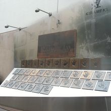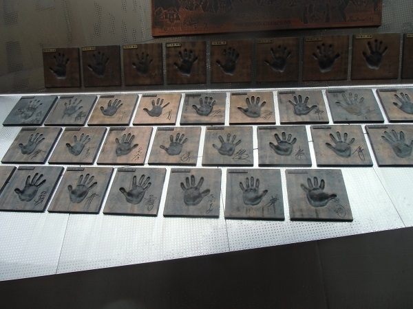 碑は上部に権藤監督の胴上げシーンが彫られ、その下に選手達の手形が並んでいます。