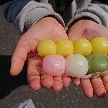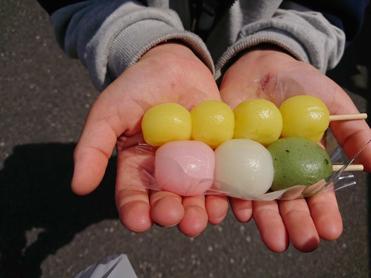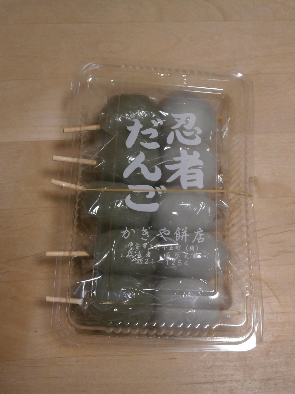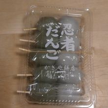 伊賀上野で350年以上続く老舗のお餅店で、たくさんの種類の団子やお餅・おかき等が売られています。今回は食べ歩きように三色団子ときびだんご、そして持ち帰り用に忍者だんごを購入しました。忍者だんごは白い餅の中にこしあん、よもぎの餅の中につぶあんが入っていました。