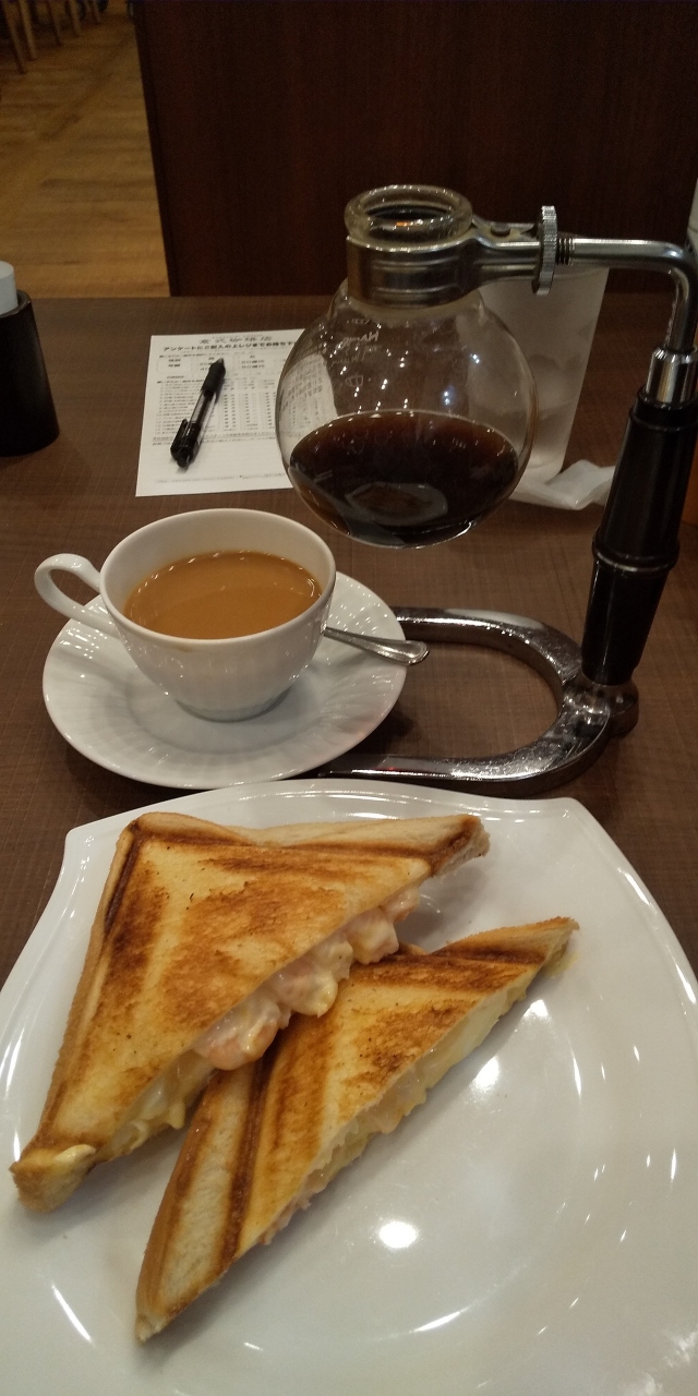 珈琲がサイフォンで出てきました。1杯より少し多くて嬉しいです。コーヒークリームはポーションじゃないのも嬉しいです。卵とえびのホットサンドも美味しかったです。プラス90円でサラダがつけられます。レジの男性スタッフが感じ悪かったです。