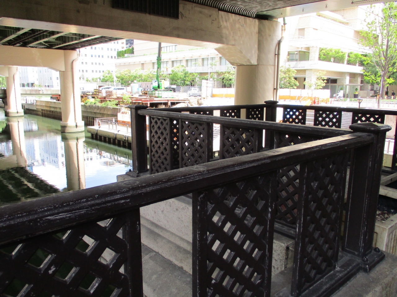 本町橋は本町通、東横堀川にかかる橋です。市内で現役最古参です。大正2年に架け替えられました。もとは大坂城築城の折に架橋されたといわれています。どっしりとしたアーチ橋です。入れないようになっていましたがバルコニーがついています。現在は上を阪神高速が走っているので若干暗めなのが残念です。