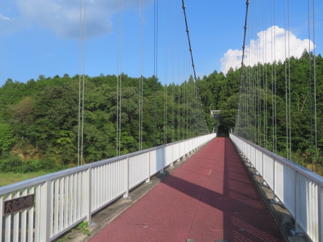 旧南那須町の大金の街はずれにあります、荒川に架かる主塔が片側のみの非対称の珍しい吊り橋で長さは97mあります、橋のたもとに展望台があり、荒川や街並みを見ることができます、周辺には遊歩道があり歩いている人がいました、橋の入口に大きな駐車場がありました。