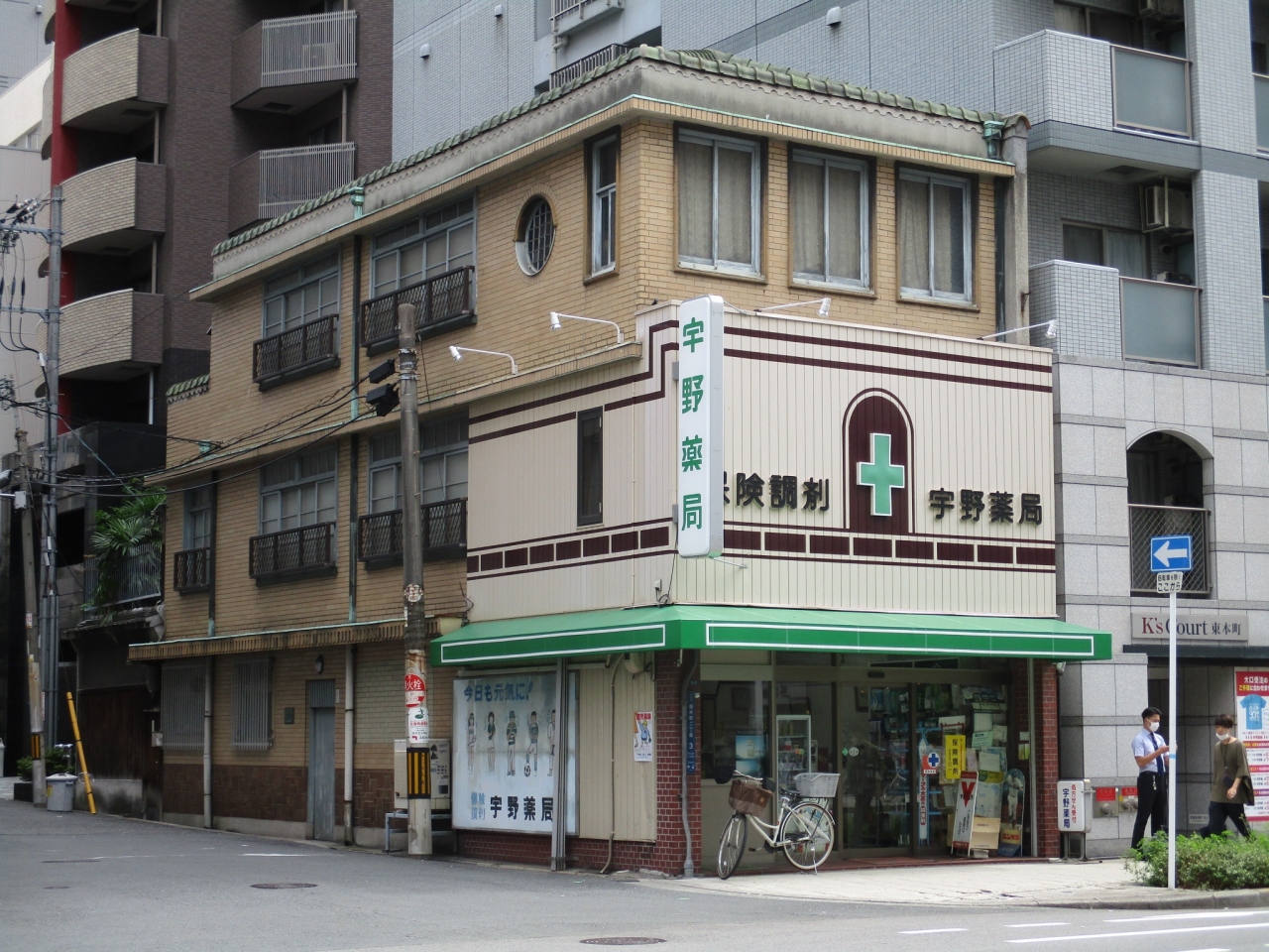 宇野薬局は本町橋近くの松屋町筋にあります。正面から見ると昔からあるふつうの薬局に見えますが、横から見るとレンガでできていて、丸い窓やこまかい装飾がついていて、レトロ建築だとわかります。昭和9年の建築で、登録有形文化財です。