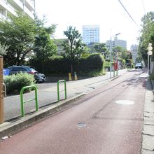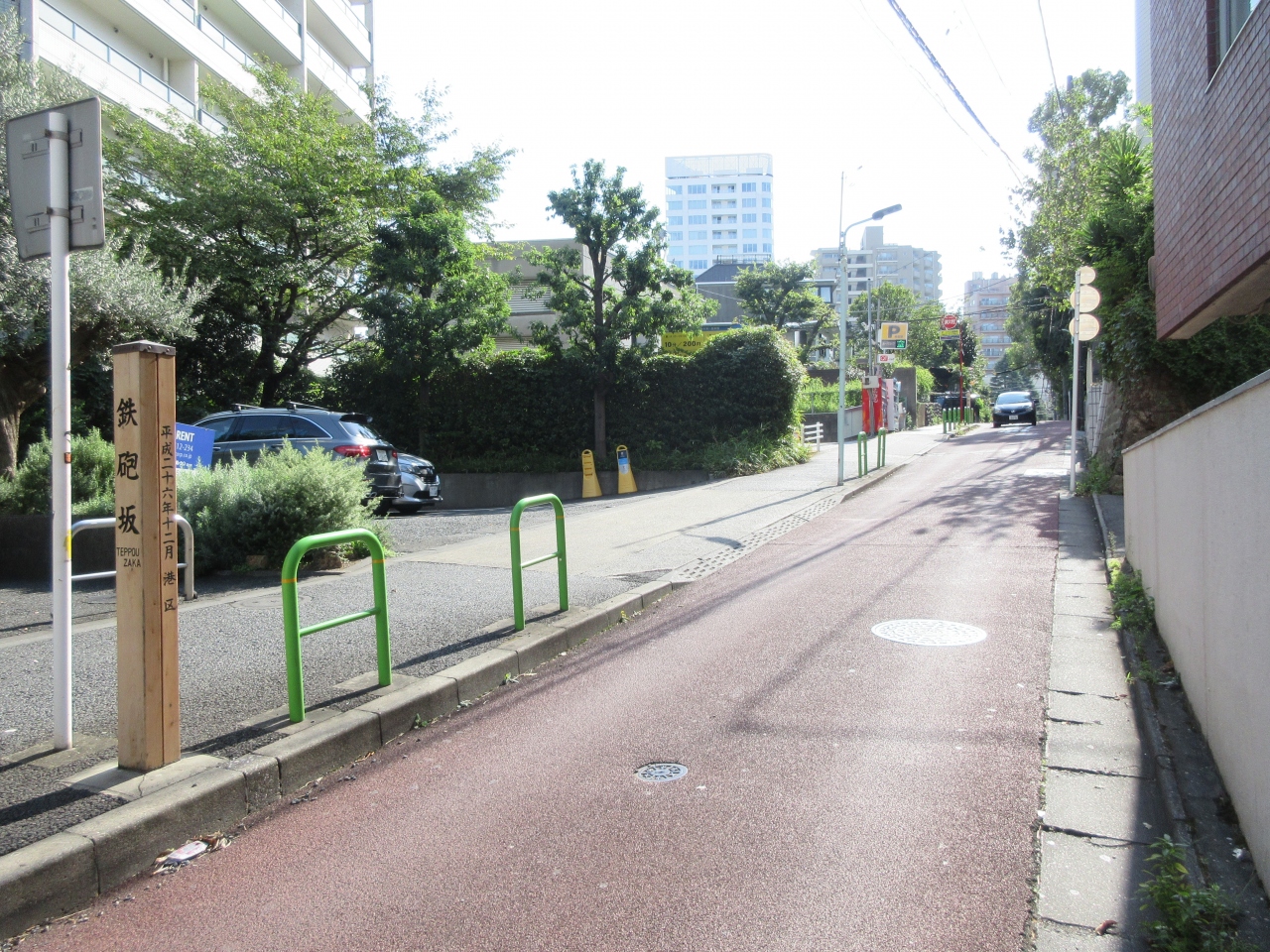 外苑西通り・笄小学校西交差点を入ったところに造られた、一方通行の短い坂道です。江戸時代に幕府の鉄砲練習場があったことから名付けられたそうです。現在、坂の両側にはマンションが立ち並び、坂はタクシーの通り道になっていて交通量が多く感じられます。この坂道を上がり切った先には平らなエリアがあり、さらに先には北条坂と名付けられた坂道が続いています。同じ通りにもかかわらず、途中で名前が変わる坂道を不思議に感じました。
