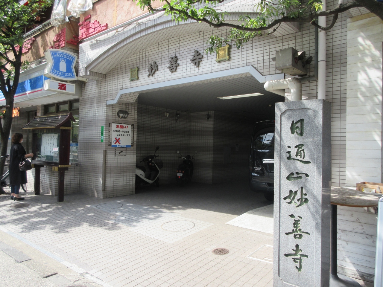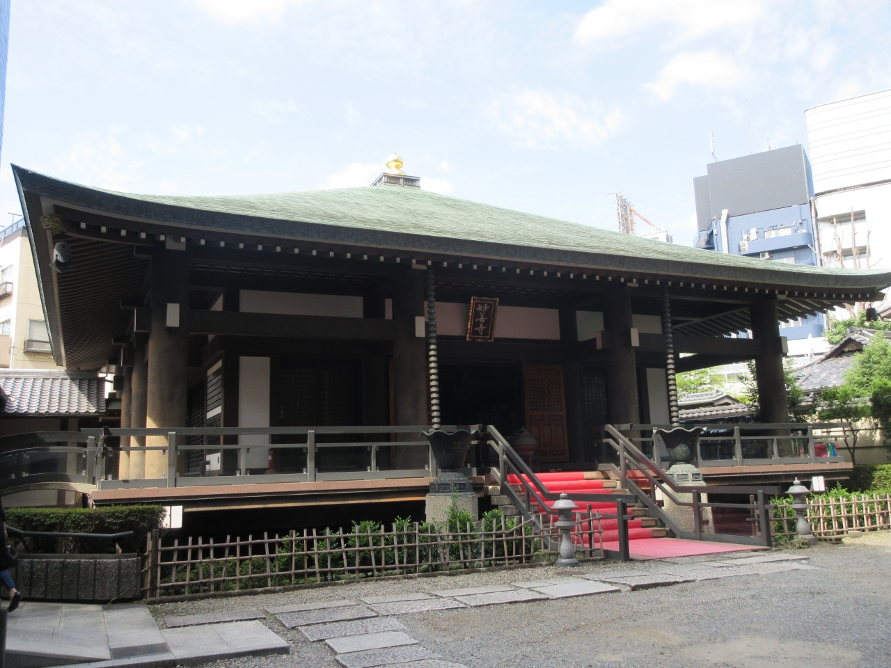 六本木けやき坂通りを上がり切った正面に建つ日蓮宗の寺院です。コンビニと食事処の間に建つ薄暗い入口と、入口の上に建てられたマンションの姿からは寺らしさが感じられませんが、入口を入った先に建つ本堂は大きく堂々とした造りをしています。本堂周辺には池が巡らされ、立派なコイが気持ちよさそうに泳いでいました。特に見どころはありませんが、高級ブランドショップが建ち並び、クリスマスにはライトアップされるけやき通り坂を訪れた際に立ち寄ってはいかがでしょうか。