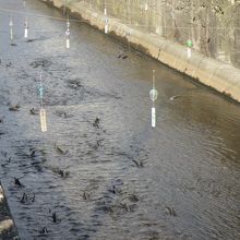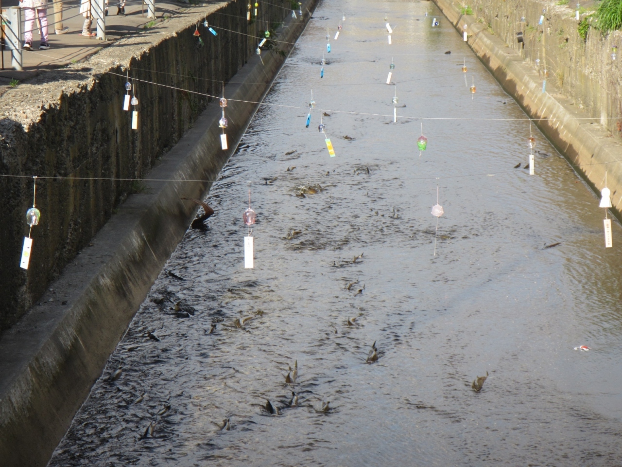 風鈴が飾られていたので、何かのイベントかなと思いきや、川面を眺めると、何と鮭の大群が…。