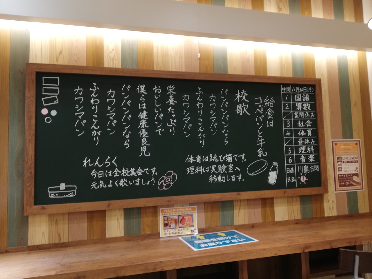 千葉駅の構内にあるカワシマパンです。コッペパンがたくさん売っていました。ピーナッツバターなど、千葉ならではのメニューもあります。てんなは学校給食のような雰囲気で、面白かったです。セットでコーヒーもありました。