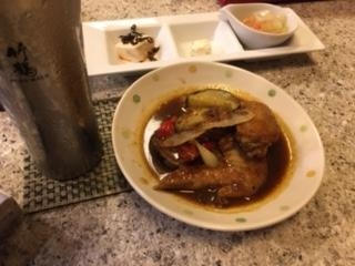 今回は、手羽先のカレー煮・タコ頭刺し・ふくらぎ刺し・出汁巻き玉子・海老フライを注文。