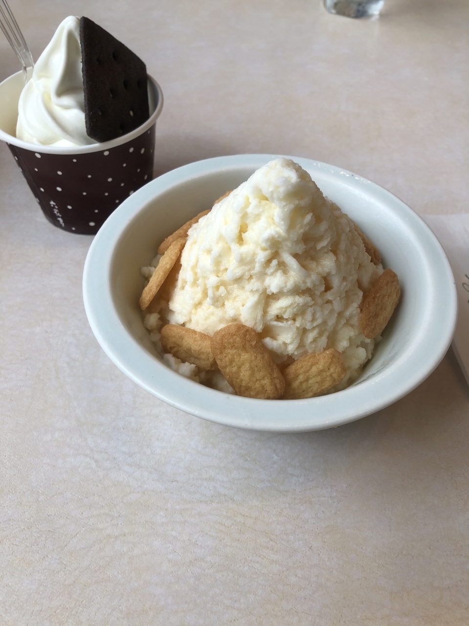 六花亭のあの花柄のパッケージのポテトチップスを発見しました。とても可愛くてかさばるのに買ってしまいました。薄めの塩味なのでポテトの味がちゃんとするポテトチップスで美味しかったです。円山店は喫茶室が併設されているので夏限定のかき氷をいただきました。
