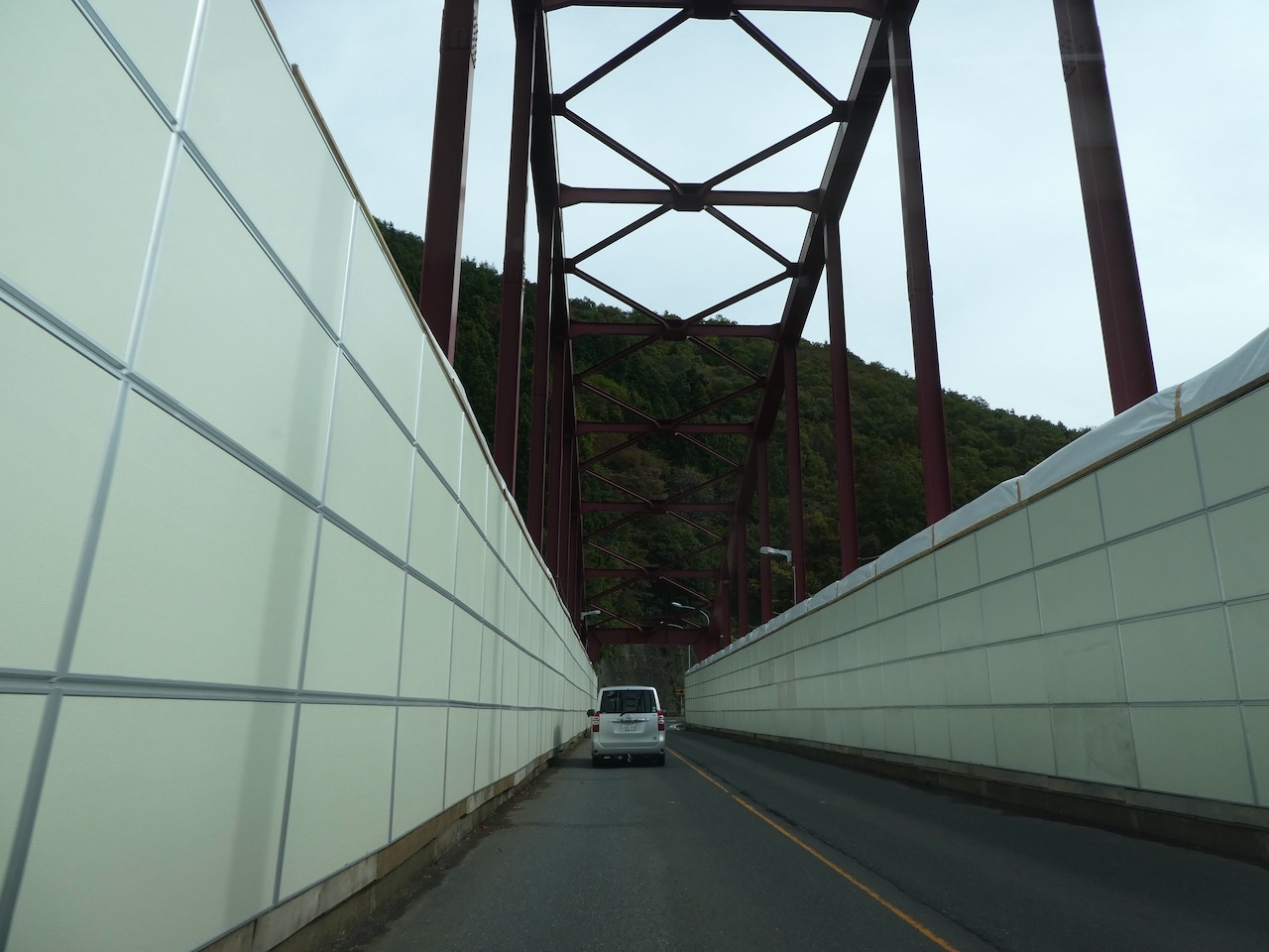 三国街道を新潟から峠を越えて下ってくるとやがて現れる赤いアーチの鉄橋。紅葉に映えてきれいな、はずが、訪問時はなぜか両側を布のシートで包まれて工事中でした。塗装工事かな?