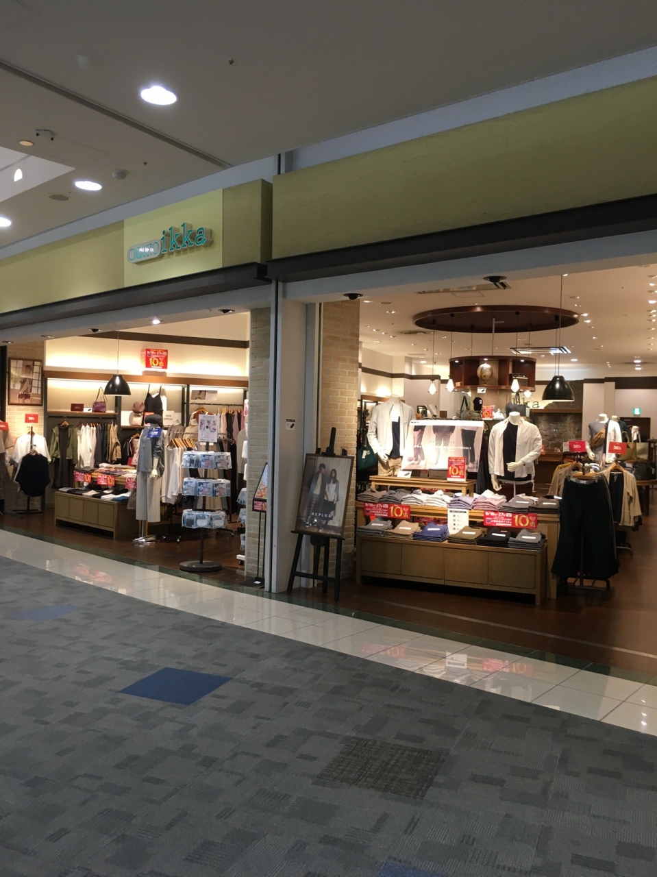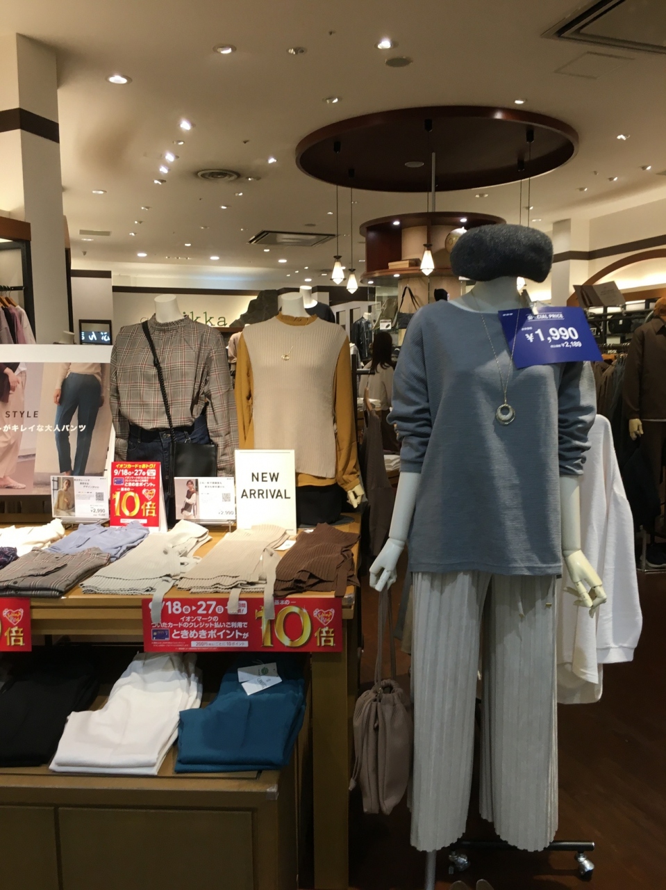 店内は赤いイオンのときめきポイント10倍の張り紙がたくさんありました。女性用の洋服屋と思ったら男性用もあり若者向けのものが多く、顔がないマネキンがたくさん配置されていました。お洒落なカバンもの置いてありました。