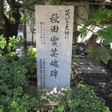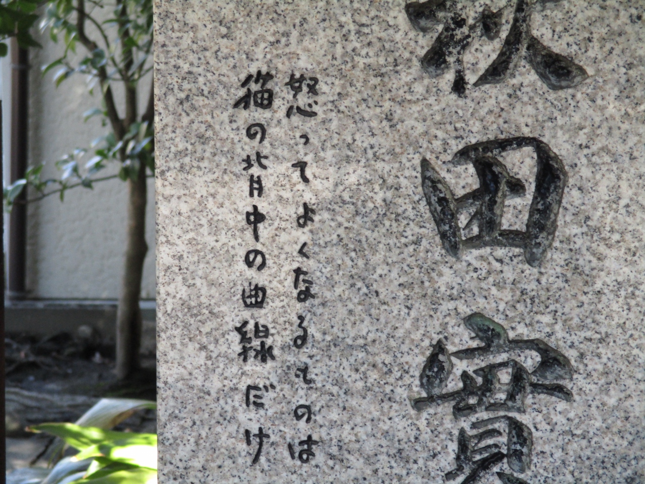 秋田實は上方漫才を代表する漫才作家です。玉造の出身です。笑魂碑が玉造稲荷神社の境内にあります。少しわかりづらいところにありました。碑に「怒ってよくなるものは猫の背中の曲線だけ」という文字が刻まれています。ご本人の自筆文字でしょうか。これを読んで楽しい方だったんだろうなと想像しました。