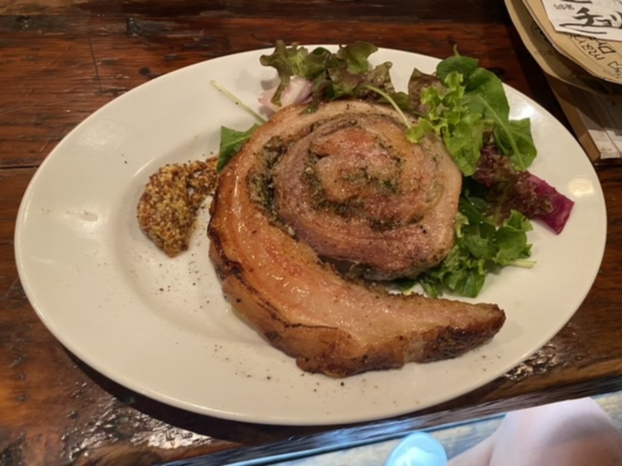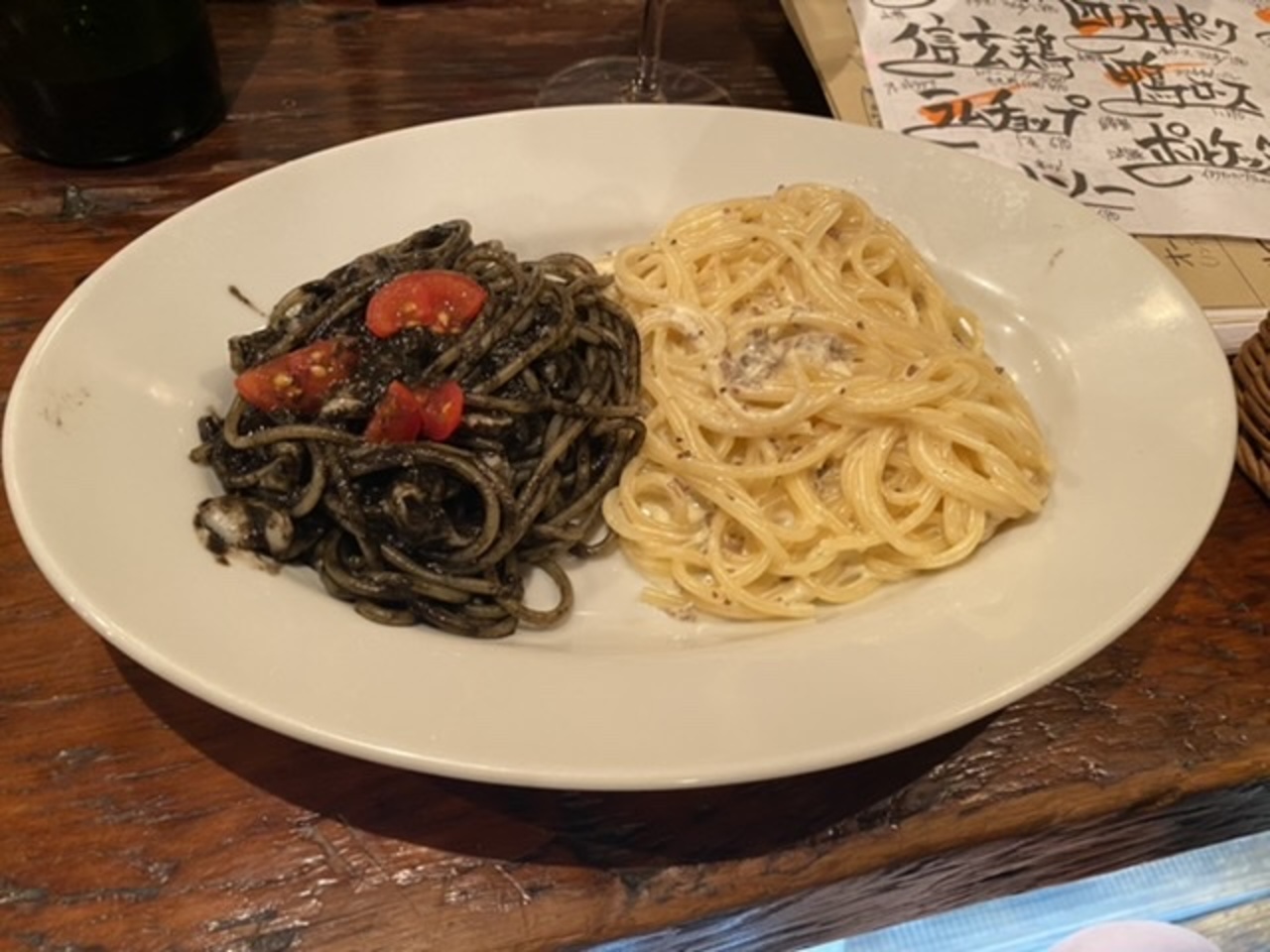 先ずはお通しのオリーブ!チリの赤ワインをたのんで、、、ポルケッタ。脂がのったポルケッタを赤ワインで流し込みます。〆はイカ墨とトリュフオイルクリームのダブルスパゲッティ!美味しいです(^^)