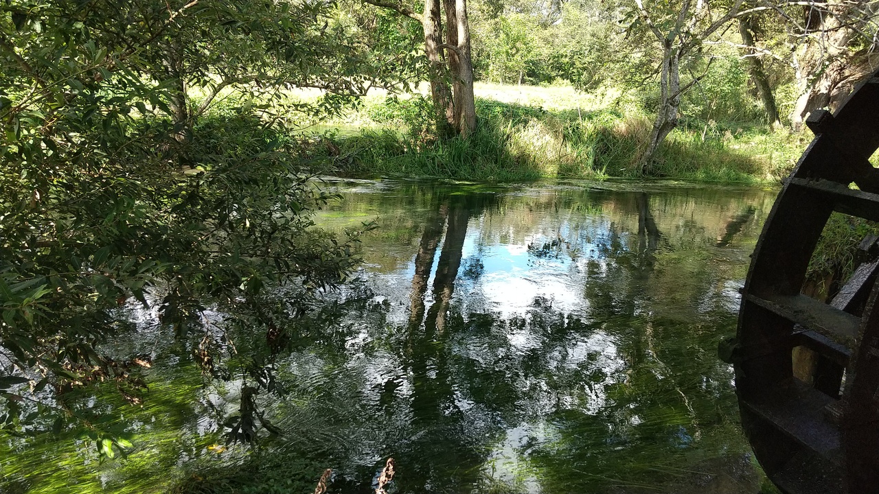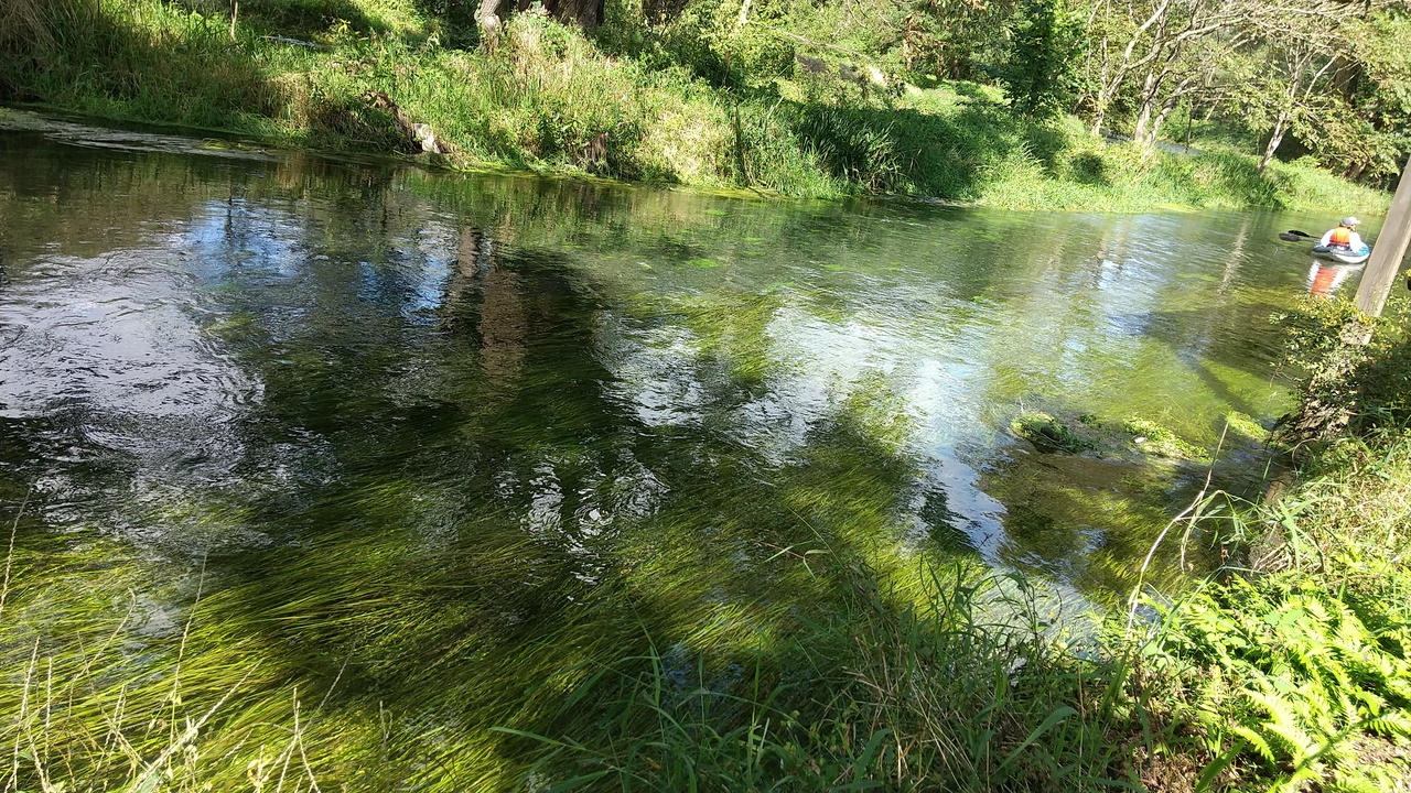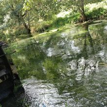 雨上がりで水量が豊富で水草の緑色が太陽の光で美しく輝く様子は幻想的でした。