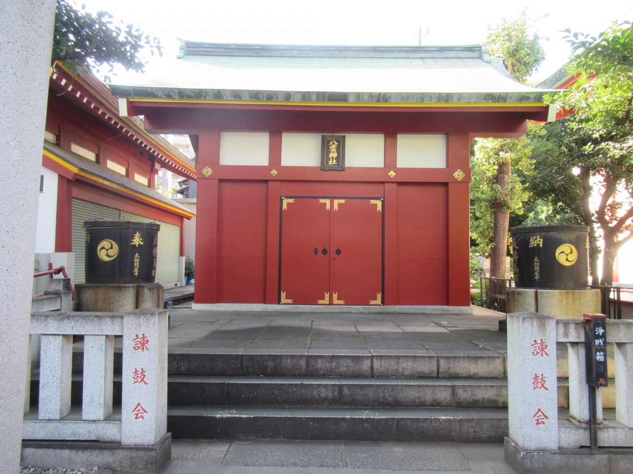 神田明神の御神殿の左側に並ぶ小さな神社の1つです。水神社の右に、小舟町八雲神社と大伝馬町八雲神社が並んでます。大伝馬町の社はとてもシンプルで豪華さはありません。社の手前に大きな鉄製天水桶が一対置かれているだけで、参拝客もいませんでした。