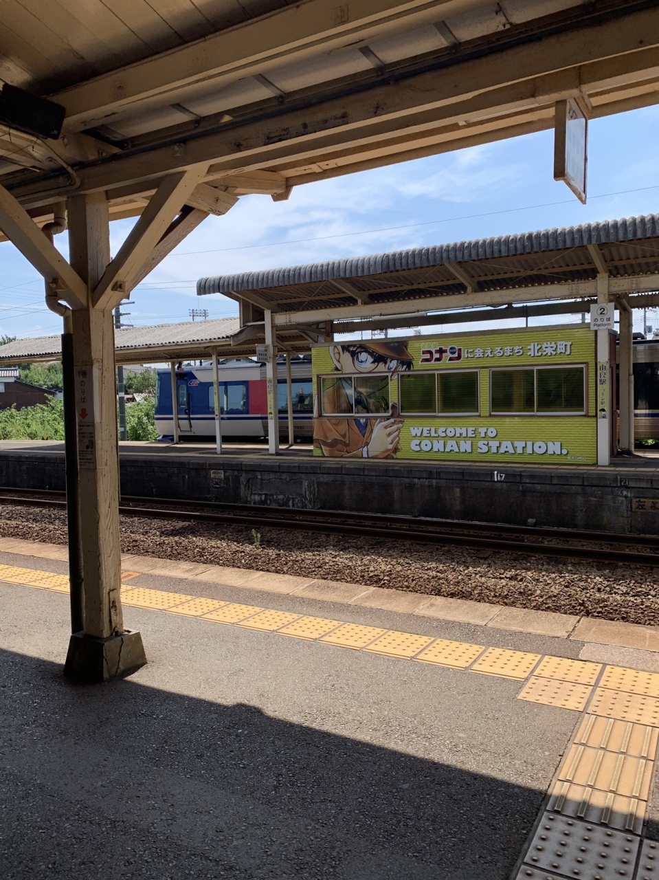 青山剛昌ふるさと館に行くため由良駅で下車しました。駅前にはコナンにちなんだ像や顔出しパネルもあり、コナンが好きな方にはたまらないスポットだと思います。駅には観光案内所が併設されていて周辺の地図やパンフレットが手に入ります。