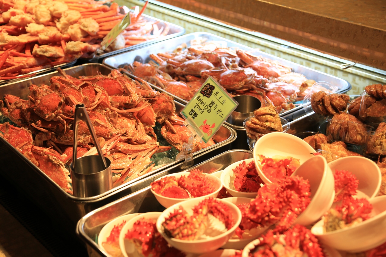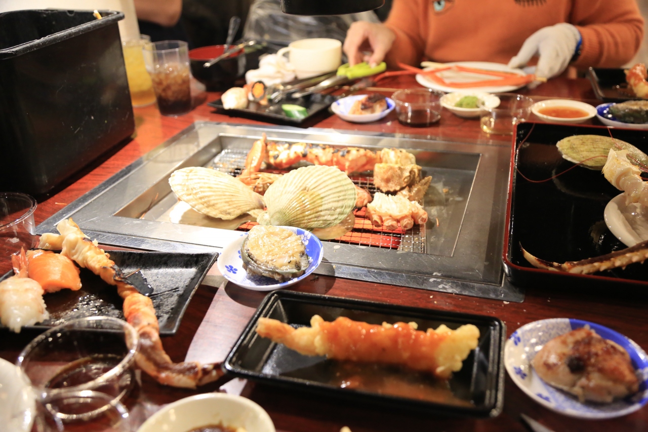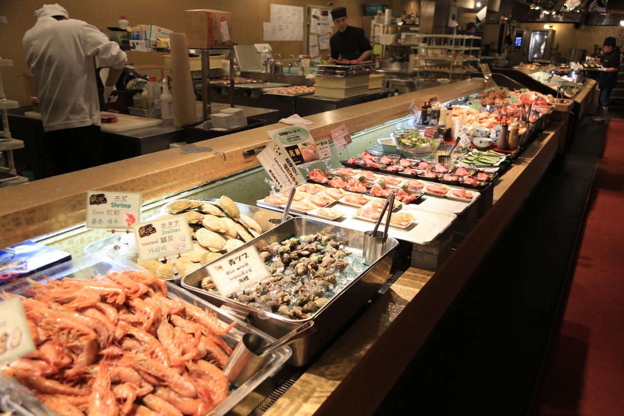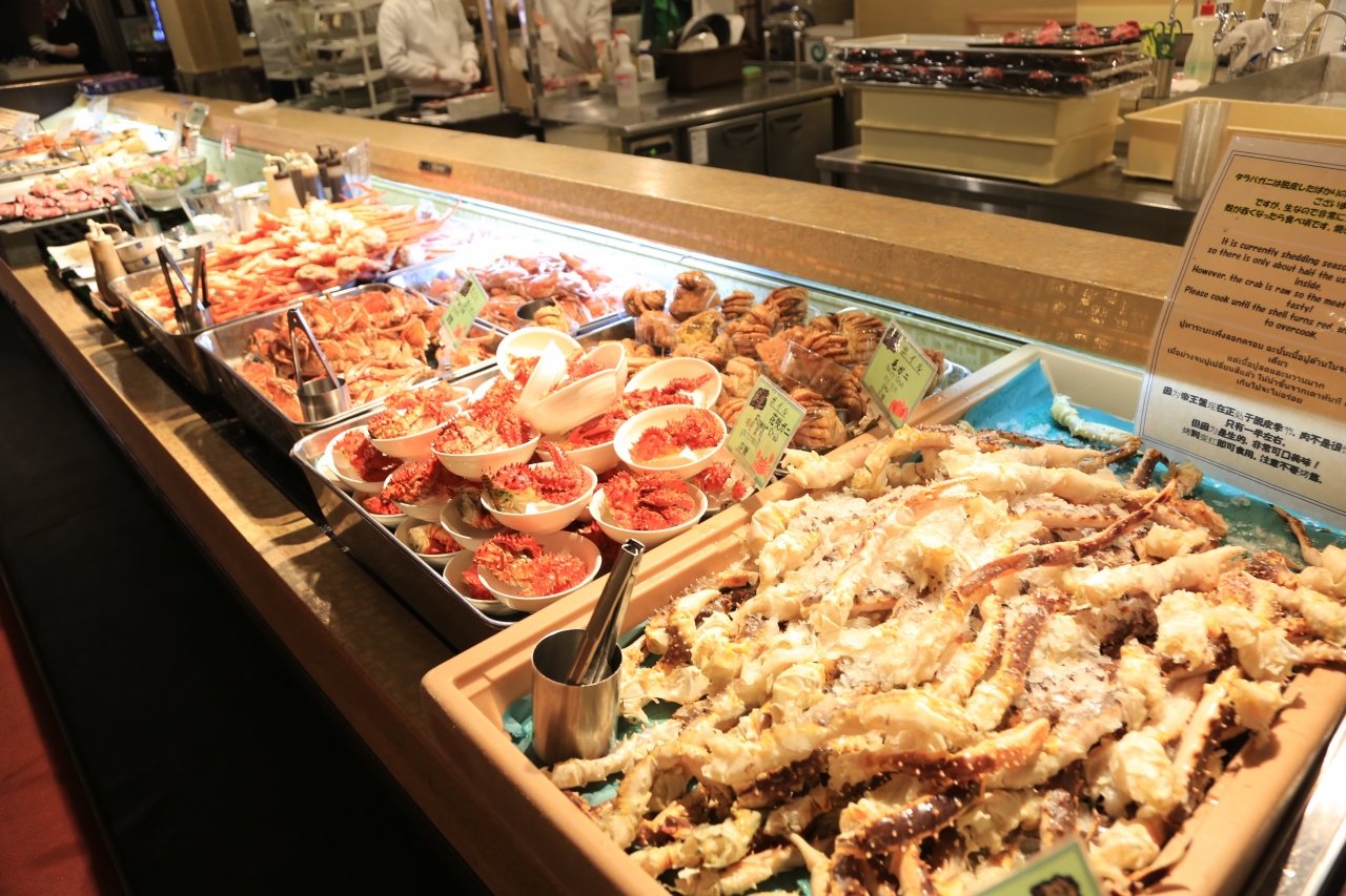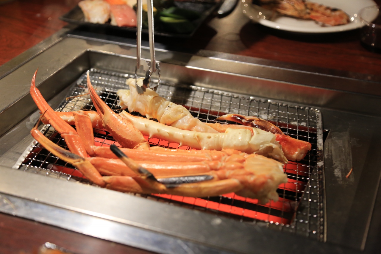 BUFFETはカニ系や海鮮系がメインとなるが、その他にも寿司、肉系もあるので甲殻類が苦手な方でも食べることは出来る。基本的にセルフサービスなので各自でネタを取りに行き、テーブルでBBQする。軍手の準備もあるから少々熱くても大丈夫かな。