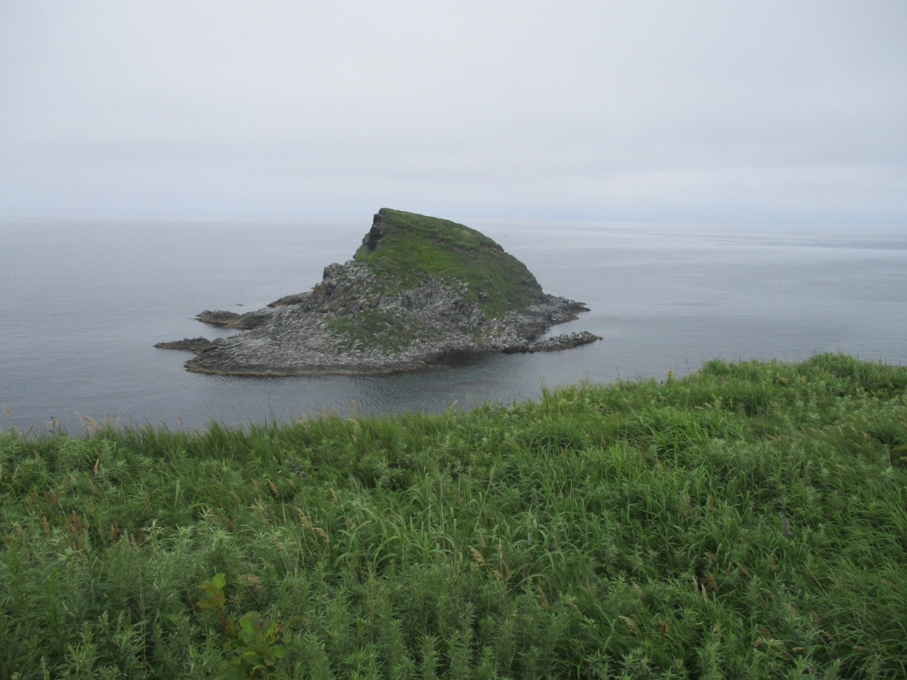 エゾカンゾウの大群落地の富士野園地からウミネコが集団でコロニーをつくる「ポンモシリ島」が間近に見えます。