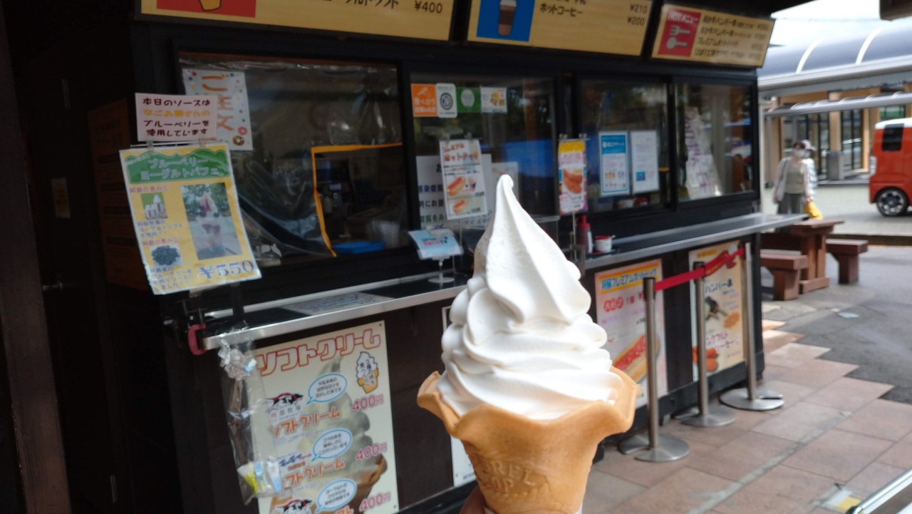みんなの九州切符で阿蘇駅まで来ました。道の駅は目の前にありました。新鮮な野菜や果物が店頭に並んでいました。阿蘇の牧場でとれた牛乳を使ったソフトクリームがありました。濃厚な味わいでとても美味しかったです。