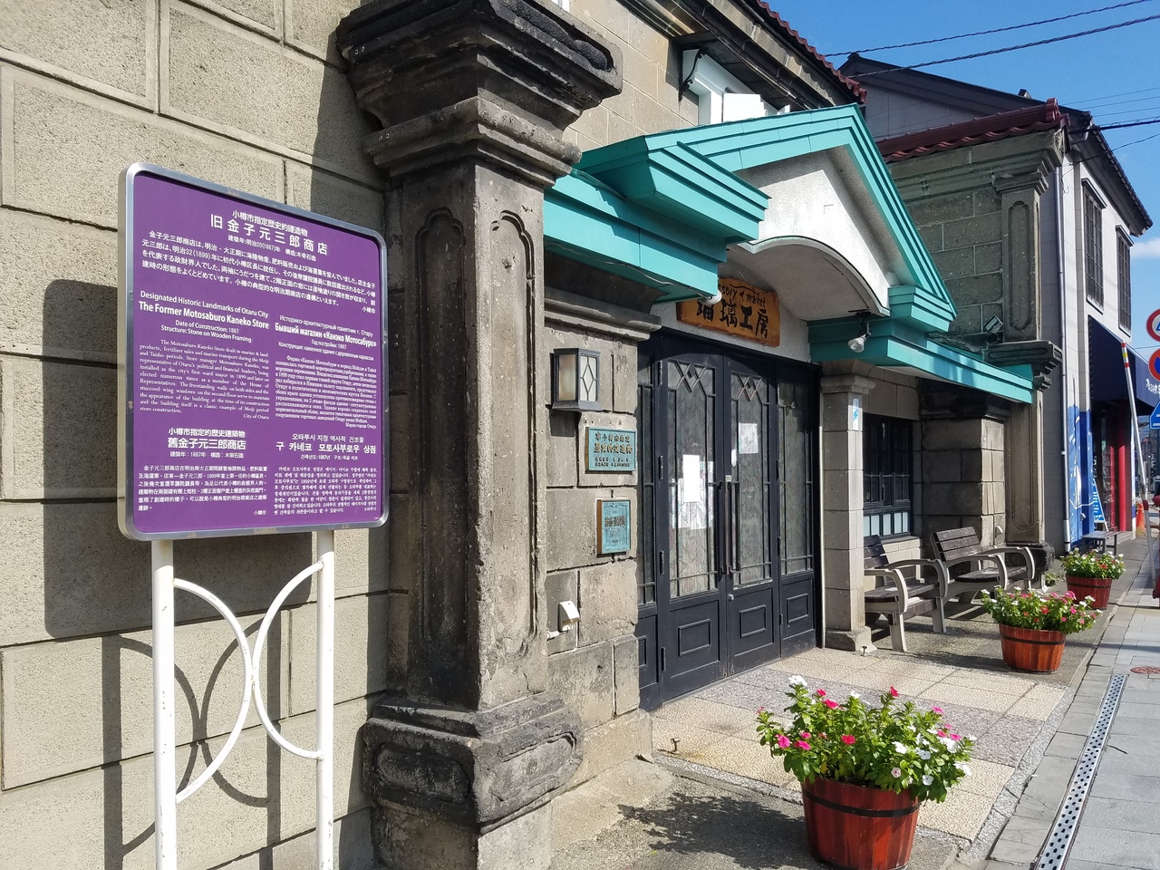 小樽市指定歴史的建造物、 旧金子元三郎商店です。現在では瑠璃工房というガラス細工のお店として営業しています。