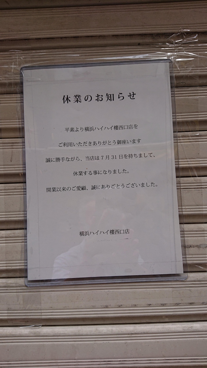 横浜駅西口から徒歩5分ほど。たまがった、大勝軒、大和家、そしてこの横濱ハイハイ樓 横浜西口店がある裏通りがあるのですが、しばらくご無沙汰しているうちに横濱ハイハイ樓は閉店。休業しますと張り紙にありますが、再開はなさそうですね。残念。