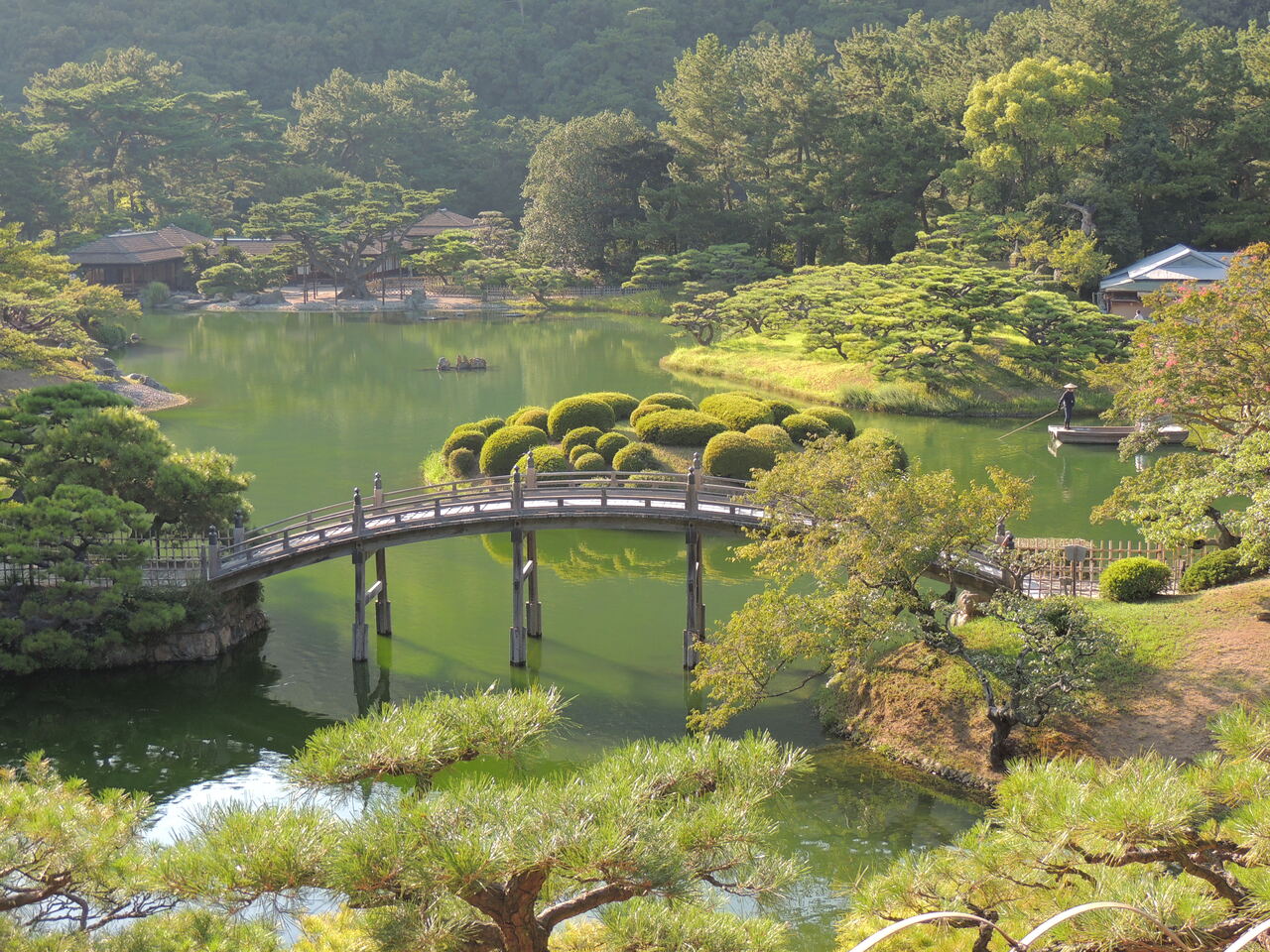 栗林公園の中の南湖の中に岩が見えました。四つの岩のまとまりで、中国の不老不死の仙人がいる理想郷を表していて、仙磯、せんぎと呼ばれているそうです。この岩が年に2回だけ黄金色に輝く時があるということで、是非見てみたいと思いました。