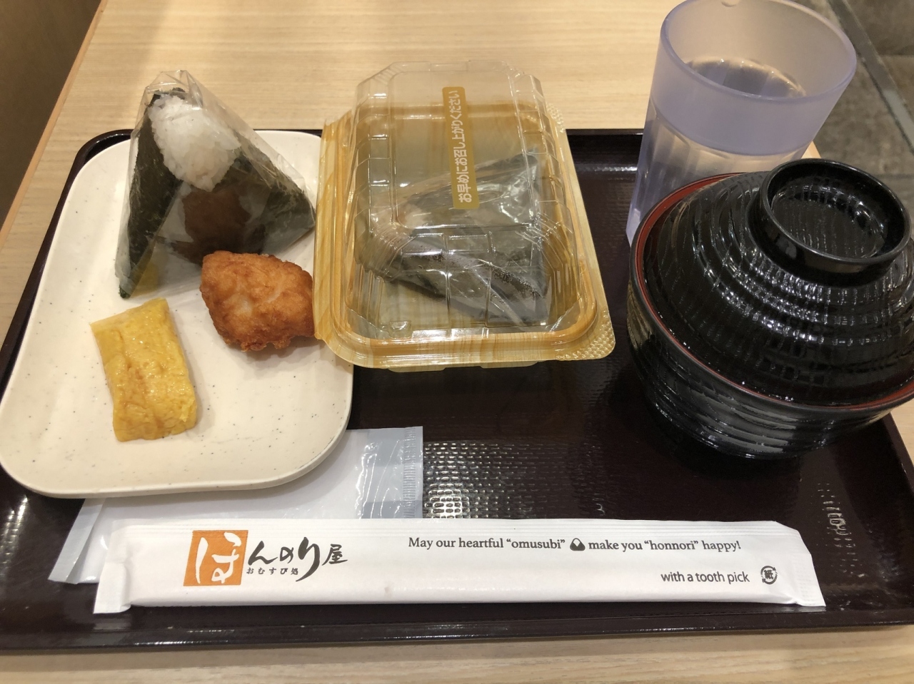 200円以下のおにぎり2個、味噌汁、唐揚げと卵焼きがついて540円。こちらを頂きました。