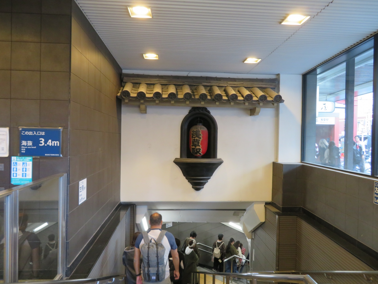 東京メトロ銀座線の浅草駅。銀座線の起点駅で上野、銀座を通り渋谷駅と結んでいる。昭和2年(1927年)に開業した、東洋で最初の地下鉄駅だそうだ。駅を出ると目の前は松屋浅草店で、新仲見世商店街の入り口。赤ちょうちんの飾られた1番出口を出て1分歩くと雷門に着く。4番出口には浅草観音に因んだ屋根と朱塗りの柱が設置されている。