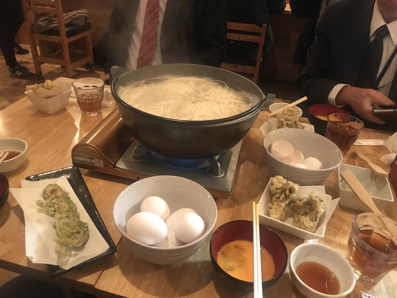 大きな釜でぐつぐつさせたうどんを、出汁が入ったつゆか、卵に醤油が入ったつゆにつけて食べます。