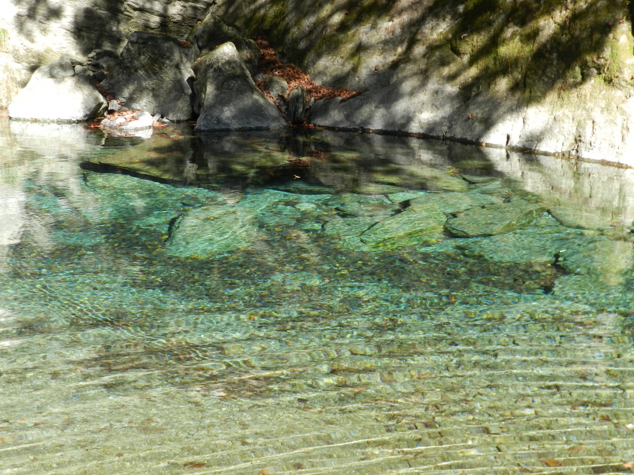 流れる水は驚くほど透明で、日が当たるとブルーやグリーンがかった色に見え、とても綺麗でした!