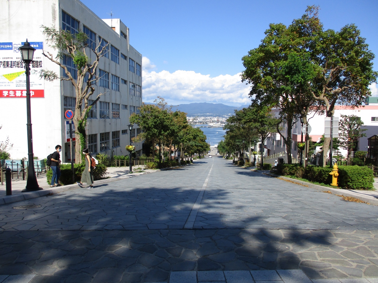 函館は坂の街です。そのなかでも函館の坂でもっとも有名な坂と言われ、テレビドラマや映画などに登場する八幡坂です。坂から港湾を見下ろす坂の写真の奥には青函連絡船記念館として現存している摩周丸が海上に構えています。とても美しい景色でした。
