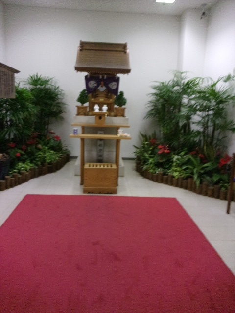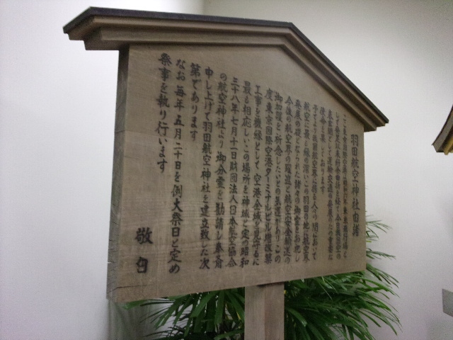 羽田空港第1ビルの中にある神社です。ちょっとわかりにくい場所にありますので、注意しないと見逃してしまいます。1階の中央エアポートラウンジの横に細い通路があって、こちらを進むと神社が。一部屋名の中に神社の社と説明板などがあります。旅の安全を祈っていざ出発です。