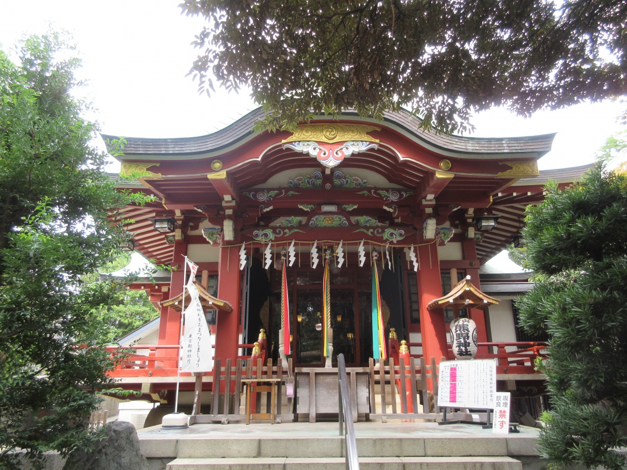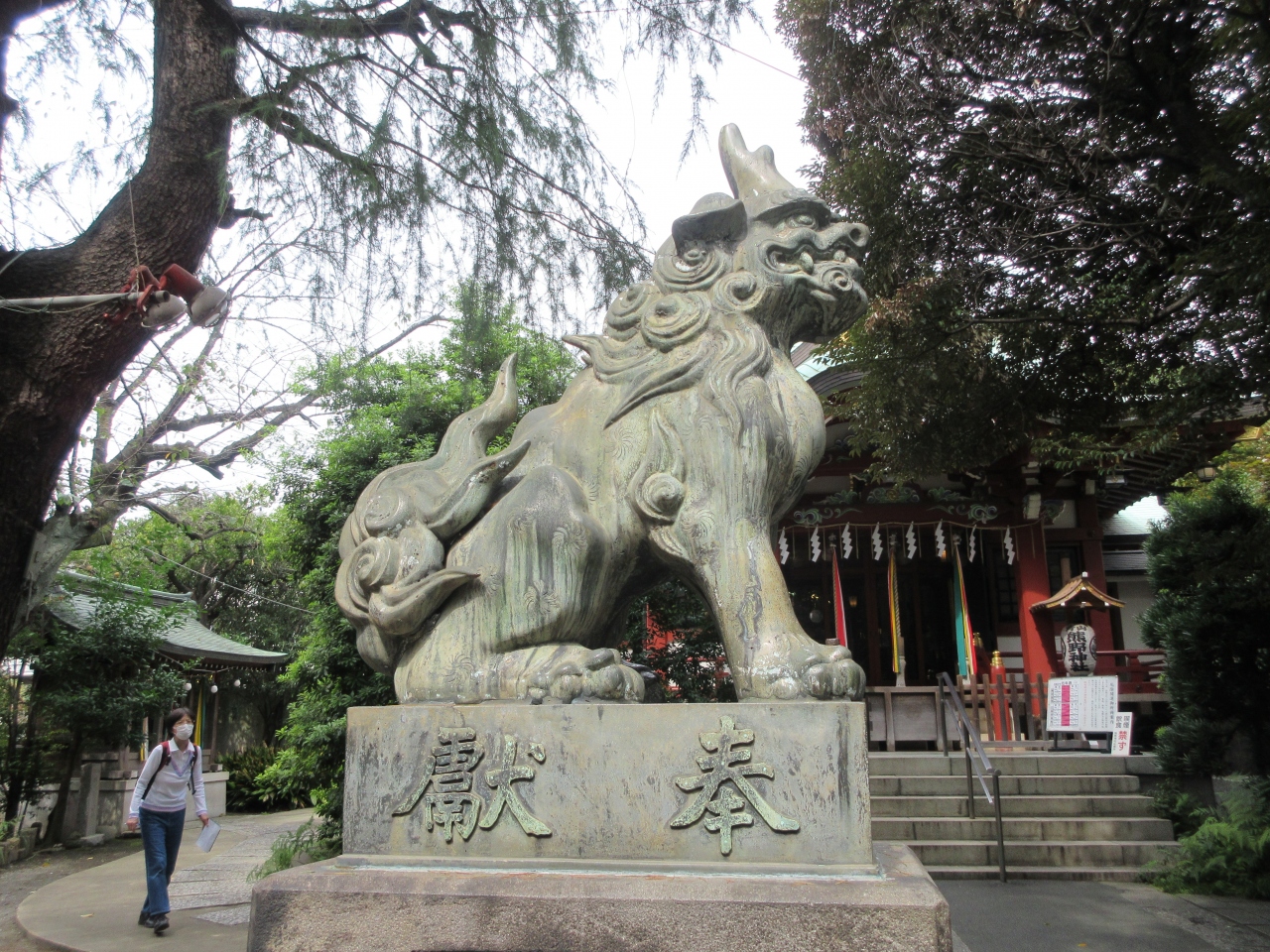 外苑西通りの東側に並行する勢揃坂上にあります。1645年に現在地に移遷し、青山総鎮守となりました。説明板はありませんでしたが、後で調べると植林、樹林の神様として建築関係の方々に篤く信じられているそうです。コンクリート造りの社殿は色鮮やかでした。境内に伏見稲荷大明神や力石があります。黒光りする狛犬は特徴的です。訪れた平日昼、熱心に祈る人がいました。外苑前駅周辺を散策する際に寄ってみてはいかがでしょうか。