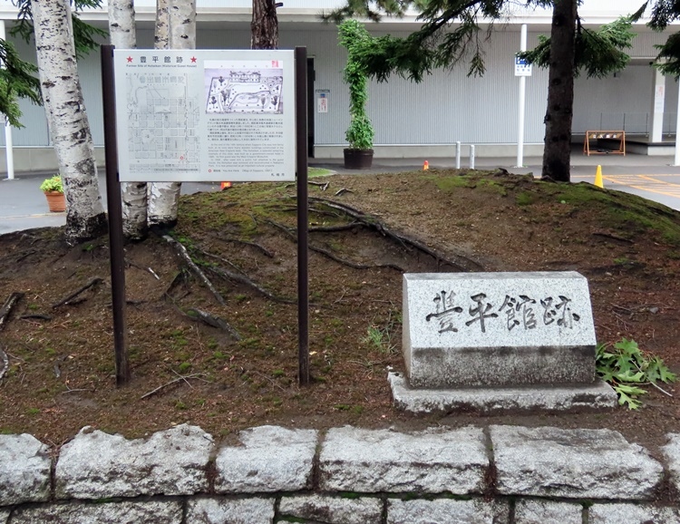 豊平館の建物は国指定重要文化財で現在中島公園に保存されています。元々は現在の市民ホールのあたりに建っていたとのことで、その碑があります。当初は開拓使が建てた洋式ホテルで、戦後ここに市民会館が建てられる計画が持ち上がり移築されたようです。