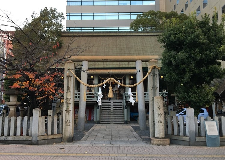 この付近は16世紀の昔はこのあたりは海だったそうです。東京なんかもそうですが、江戸時代の昔から人間はどんどん埋め立てて土地を広くしていくので、数百年前のイメージなどまったくわきませんね。船が岩礁で難破しないように岩の上に白い紙を立てて目印にしていたことから、白神という名で呼ばれるようになり、のちに祠が立ち、神社となったとのことです。