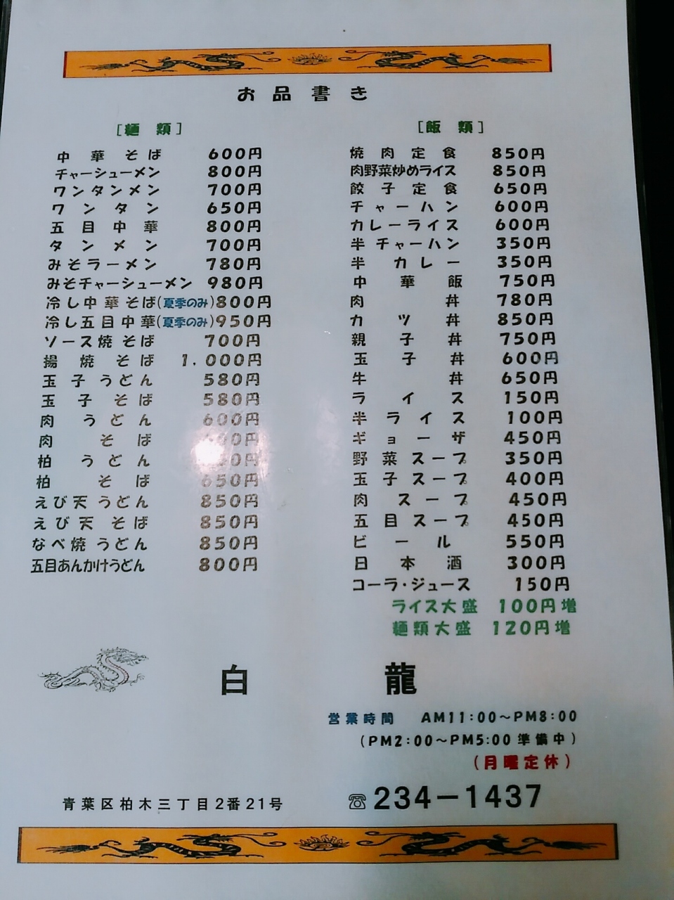 (白龍) 中華料理屋ぽい名前ですが、そばやうどん、カレー、カツ丼もあります
