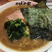 立川駅北口の狭い路地、家系のラーメン屋です。オープンな店舗は厨房を囲んだカウンター数席のみです。ランチタイムに限らず、ファンは多く、女性のひとりも見られます。こってり、テーブルにはニンニクも置かれています。
