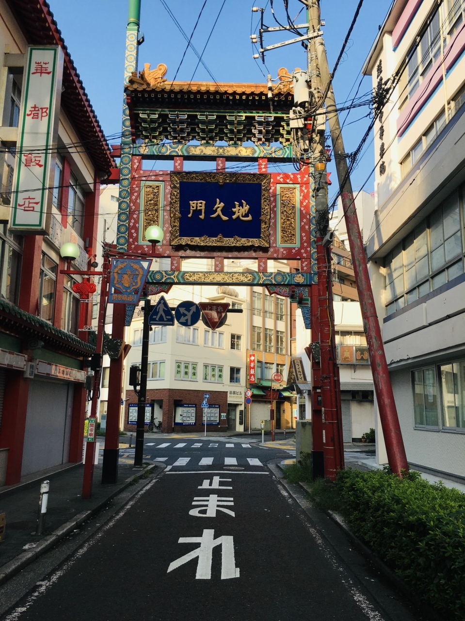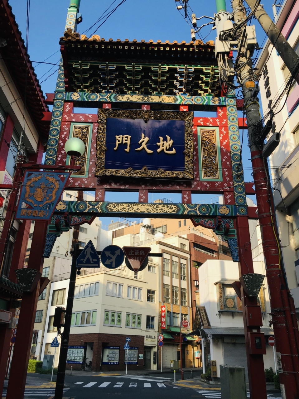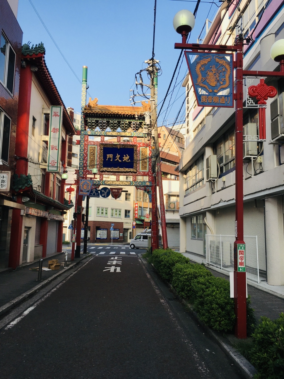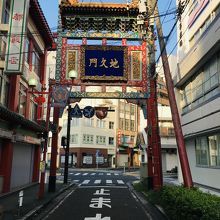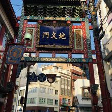 関帝廟がある通りの門の入口で門から関帝廟まで徒歩2分もかからない場所にあります。門の下の車道が1車線のため、幅も広くなく細長い門でした。中央部分から上は装飾されていて、中国ぽい色彩でした。支えている柱は赤色です。