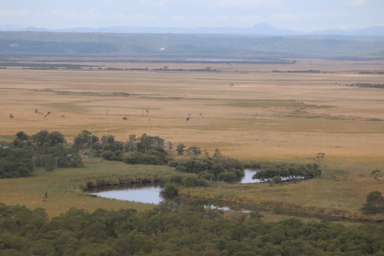 釧路湿原の代表的な展望台です。JR釧路湿原駅からも徒歩で10分ぐらいです。広大な湿原を一望でき、釧路川の蛇行の様子もわかります。もうちょっと高いところから見れれば、上空を飛んでいるドローンがうらやましい。