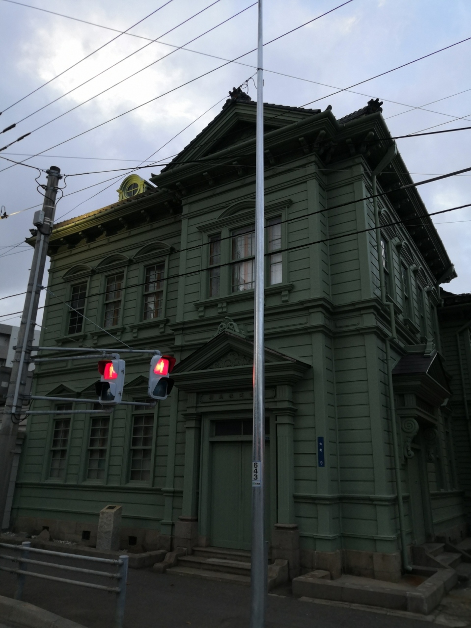 市電の末広町の駅から程近いところにあります。独特のペパーミントグリーン色をしたルネッサンス様式の建物で、今の現役の社屋として使われているそうです。異国情緒という言葉が非常にマッチする建物で、雰囲気が良かったです。