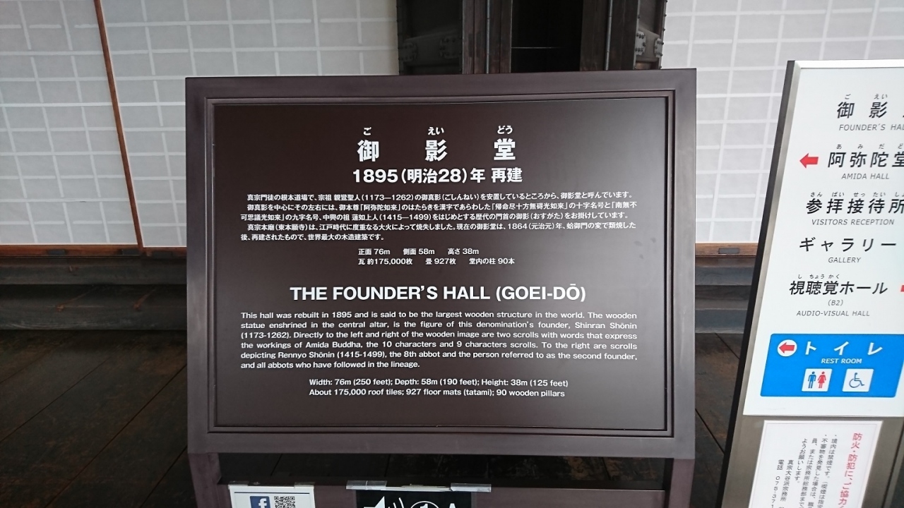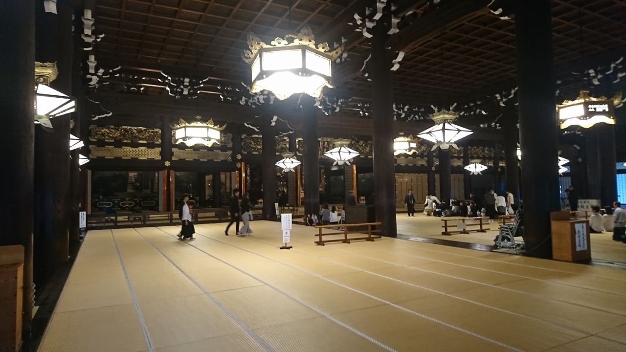京都市下京区の烏丸通り沿いにある東本願寺のお堂の一つで、阿弥陀堂の北側に建つ、世界最大級の木造建築物です。拝観料は無料で、靴を脱ぎ御影堂のまわりを歩けるようになっていました。柱の太さとか天井の高さとかに圧倒されますね。東本願寺参拝の際には阿弥陀堂や御影堂の内部見学をおすすめします。