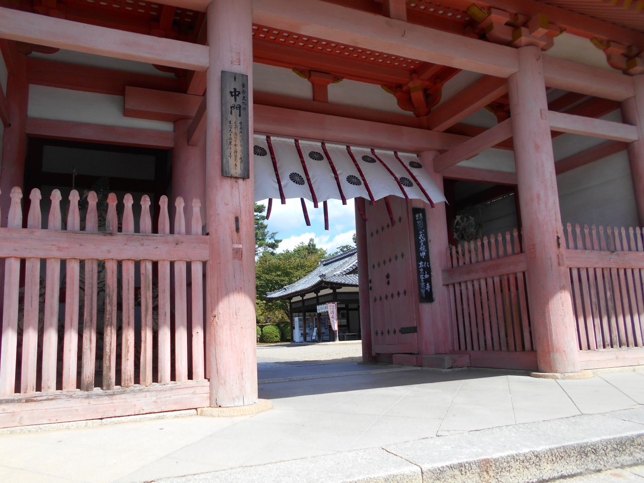 世界遺産の仁和寺二王門を潜ると真正面に見える朱色が剥げた門で重要文化財です。伽藍中心部への入り口門と言った感じで落着きある切妻造・本瓦葺・八脚門です。ここを潜ると右に五重塔、真正面に金堂、左側に名勝御室桜と観音堂が並んでいます。