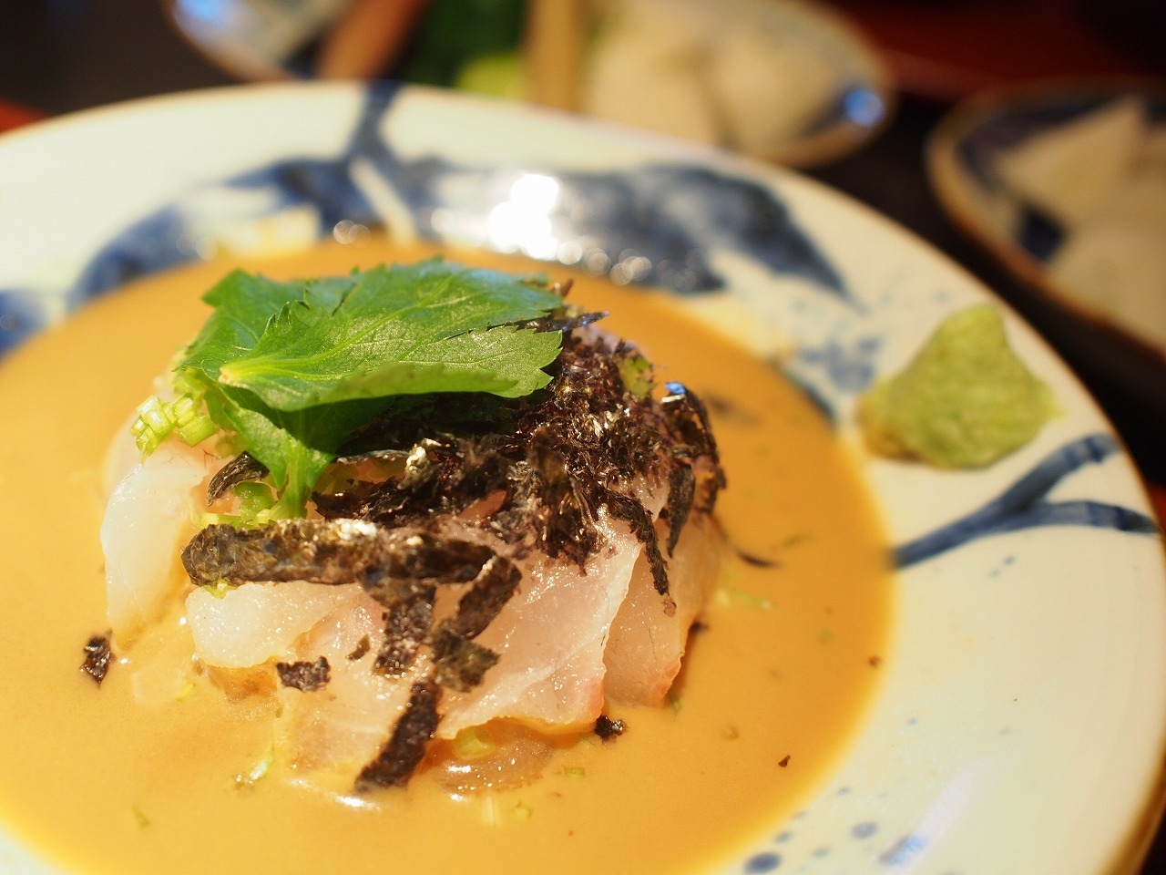 ゴマだれにつかった鯛をはじめはお刺身としていただきます。