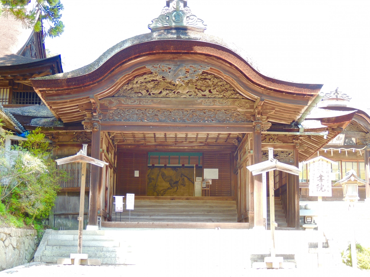 500段の階段を上ったところに、社務所門があり、その奥に書院がありました。江戸時代後期の画家である円山応挙の障壁画を見ることができます。建物そのものも重要文化財に指定されていて、客殿として使用されたそうです。