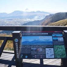 ミルクロード沿いには幾つかの展望所がありますが、ここは外輪山から突き出た場所にあり、眼下に外輪山の断崖や迫力あるパノラマある景色を体験できます。数年前訪れたときに比べ綺麗に整備され、カフェのオープンテラスがありお洒落な展望台に変貌していました。