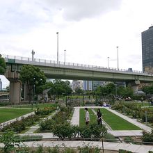 川に挟まれた中州にある公園で、都会の中で緑を提供しています。