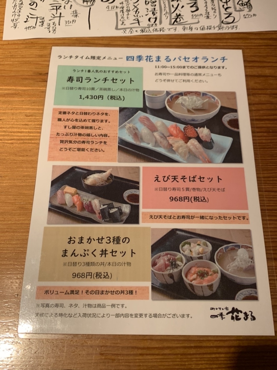 PASEOの地下にある花まる。お昼のランチセットがお得です。にぎりのセットは1430円、おまかせ3種まんぷく丼セットが968円。3種の丼は日替わりのようです。1000円以下で3種類のミニ丼が食べられてコスパ良し!味も文句なしに美味しいです